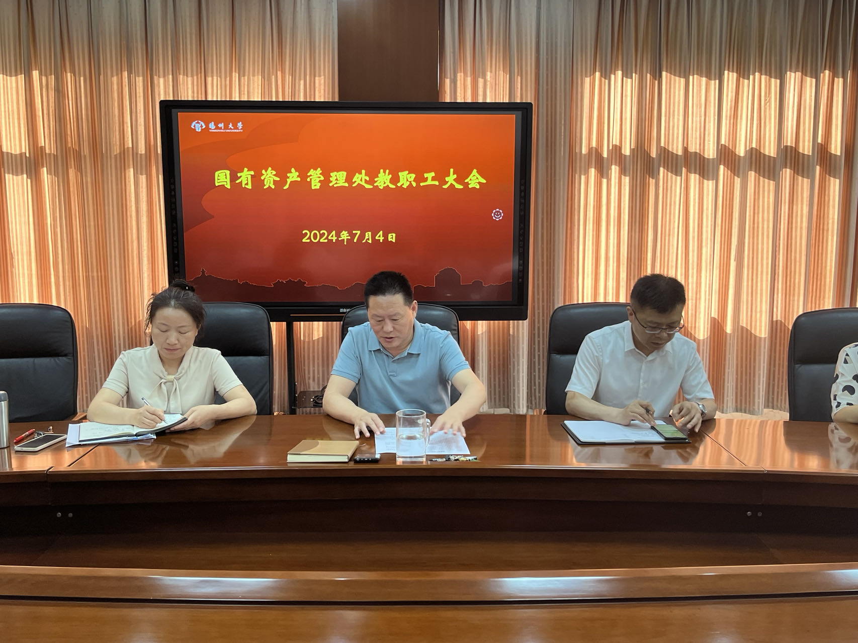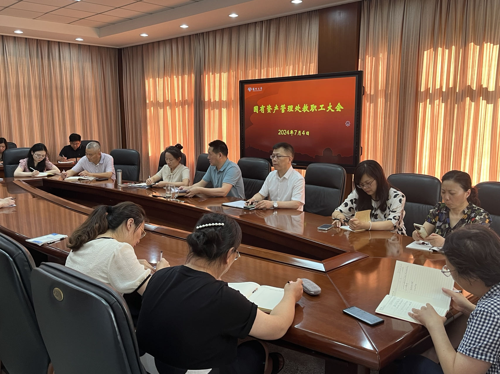 7月4日,国资处召开全体教职工大会。会议由周保垒处长主持,全体教职工参加会议。